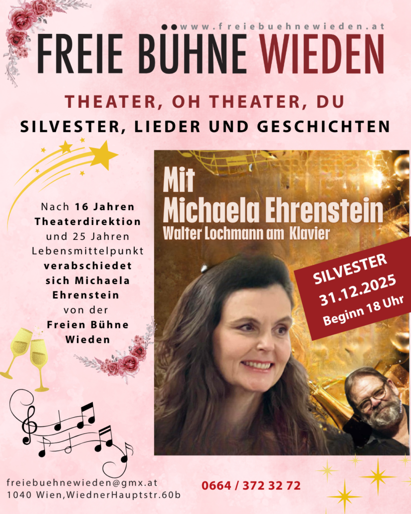 Ich lasse zu Silvester 16 Jahre Theaterdirektion und 25 Jahre persönlichen Lebensmittelpunkt FREIE BÜHNE WIEDEN mit einer bunten Palette an Gedanken und Liedern, die mich auf meinem künstlerischen Lebensweg berührt und begleitet haben, sehr persönlich ausklingen. Von Nestroy und Kreisler bis zum französischen Chanson (La vie en rose), von Lieblingsfilmen über Lieblingsstücke zu Musicalsongs (Crazy world, Send in the clowns u.v.a.).